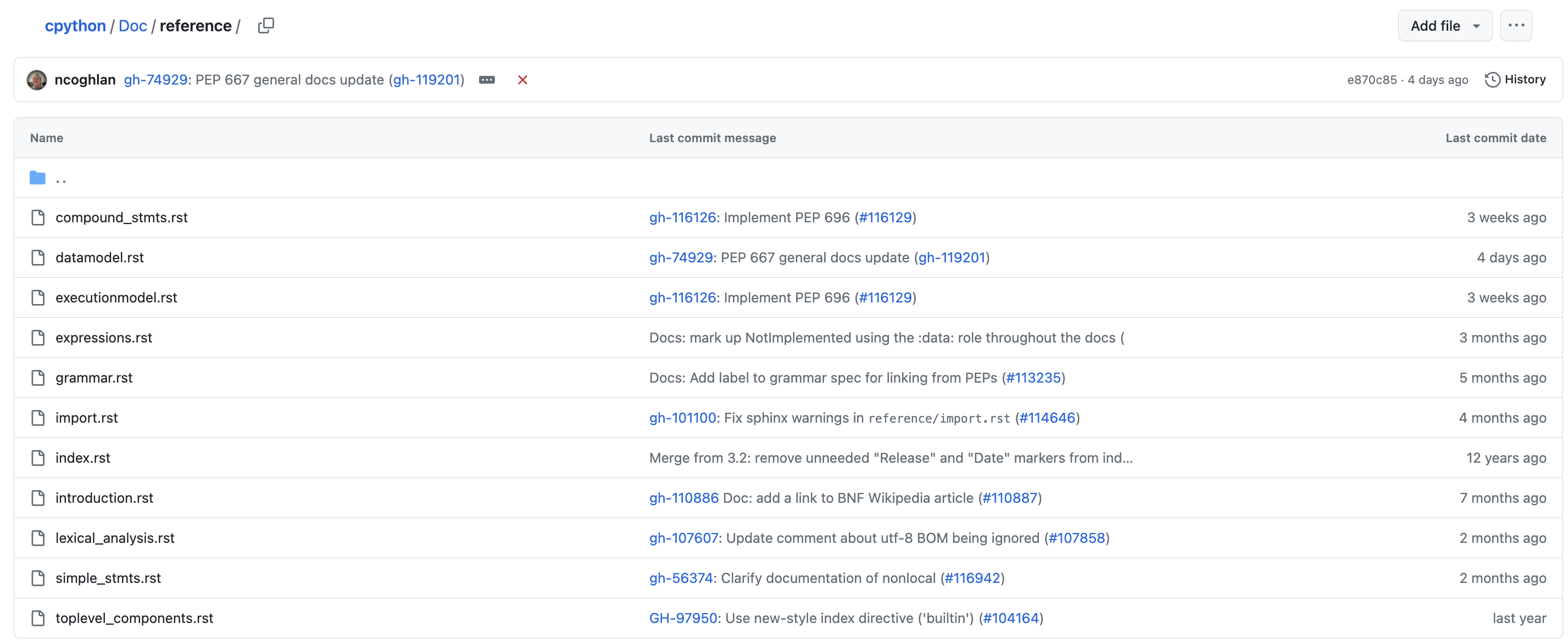 cpython repository의 해당 디렉토리에 파이썬 언어의 기능을 설명하는 rst파일이 있음 with A() as a, B() as b: SUITE # 동일 with A() as a: with B() as b: SUITE # 동일 with ( A() as a, B() as b, ): SUITE