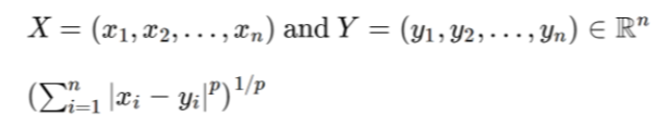https://ko.wikipedia.org/wiki/%EB%A7%A8%ED%95%B4%ED%8A%BC_%EA%B1%B0%EB%A6%AC 3. 민코프스키(Minkowski) 거리: 가장 일반적으로 사용되는 Minkowski 거리의 차수는 1, 2,∞ p=2 이면 유클리드 거리, p=1이면 맨하튼 거리