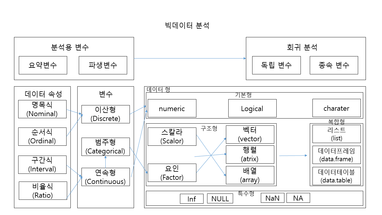- 통계에서 변수가 모여 집합자료가 되듯이 R에서도 벡터가 모여 데이터 프레임이 된다. 데이터 분석은 변수의 종류에 따라 분석 방법이 다르다.