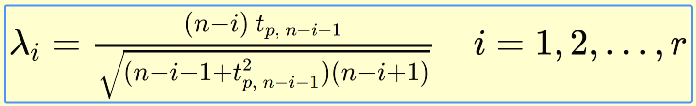 상한치 r이 주어지면 Generalized ESD test는 r번의 테스트를 수행합니다. 하나의 특이치에 대한 테스트, 두개의 특이치에 대한 테스트, 최대 r개의 특이치에 대한 테스트를 합니다.