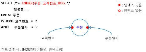 위의 그림에서도 인덱스의 위치가 명확하므로 오라클 옵티마이저가 접근 순서를 잘못 판단할 가능성은 거의 없다. 2번과 4번 컬럼에만 인덱스가 존재하므로 테이블의 접근 순서는 주문 → 고객 이다. 왜냐하면 옵티마이저는 인덱스가 있는 방향으로 접근하기 때문이다. (2번: 고객 테이블의 고객번호 컬럼, 4번: 주문 테이블의 주문일자 컬럼)