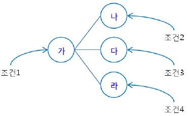 위의 그림에서 접근 경로는 12가지다(가 → 나 → 다 → 라, 가 → 나 → 라 → 다, …, …). 만약 조건1로 가 테이블로 진입할 때, 그 다음 접근 순서는 나, 다, 라 테이블 중에서 선택해야 할 것이다. 만약 조건2로 나 테이블로 진입 시 그 다음 접근 순서는 가 테이블이 되며, 이후 접근 순서는 다, 라 테이블 중에서 선택해야 할 것이다.