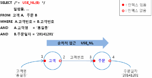 위 쿼리에서 사용한 ORDERED 힌트절로 인하여 옵티마이저는 고객 → 주문 방향으로 접근을 진행할 것이다. 앞서 연재한 ‘오라클 공정쿼리 작성법’ 부분에서 필자는 쿼리의 FROM 절에 접근 순서대로 테이블을 나열할 것을 강조한 바 있다. 이는 개발자 간에 테이블 접근 순서를 명시적으로 공유하는 방법이자, 오라클 옵티마이저의 잘못된 접근 순서를 ORDERED 힌트절을 사용해 바로잡기에 용이하기 때문이다.