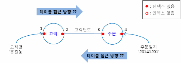 위의 그럼처럼 1번, 2번, 3번, 4번 모든 컬럼 위치에 인덱스가 존재한다면 테이블의 접근 순서는 명확하지 않다. 고객 → 주문 방향으로 접근도 가능하고 주문 → 고객 방향으로 접근도 가능하다. 양?향 접근이 가능한 것이다.
