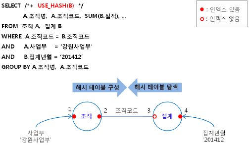 위 그림의 USE_HASH 힌트절에 의한 Hash Join 처리 과정은 다음과 같다.