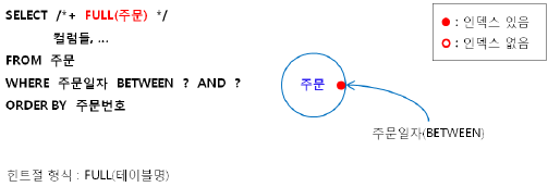 위 그림을 보면 주문일자 조건절로 구간 조회를 하고 있다. 주문 테이블의 전체 건수에 비해 구간 조회 건수가 매우 적다면 인덱스를 통해 접근하는 것이 빠를 것이다. 하지만 구간 조회 범위가 크다면 Random Access 부하가 클 것이다. 이때는 인덱스를 통한 Random Access보다 테이블을 직접 Full Scan하는 것이 더 빠를 수도 있다.