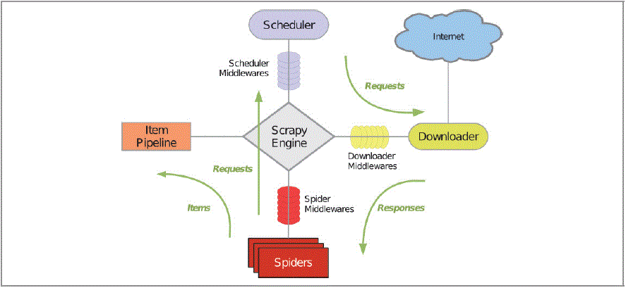 - 스케줄러 : 스케줄러는 수집주기, 프록시 설정, 멀티 에이전트 설정 기능을 가지고 있어 Scrapy 엔진의 수집에 관련된 정책 사항을 설정하는 역할을 담당